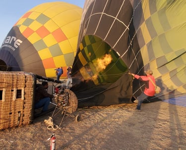 Ver cómo inflan el globo y lo preparan es parte del encanto. Las canastas varían según el tipo de vuelo: las compartidas son grandes y se dividen en “compartimientos” para 4 personas (sin puerta, hay que treparse); las privadas son más pequeñas y sí tienen puerta.